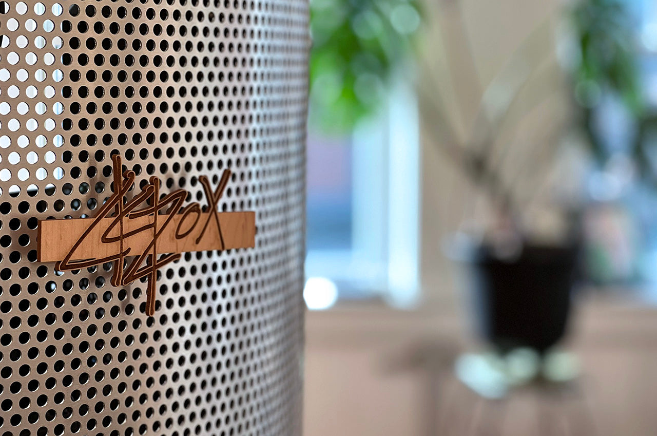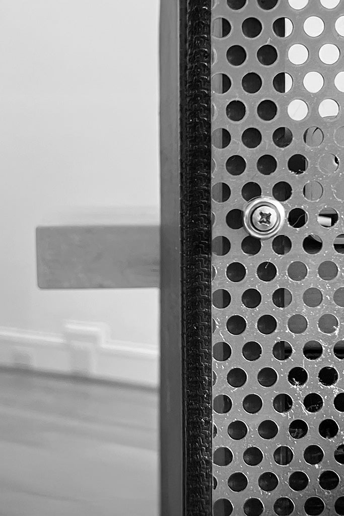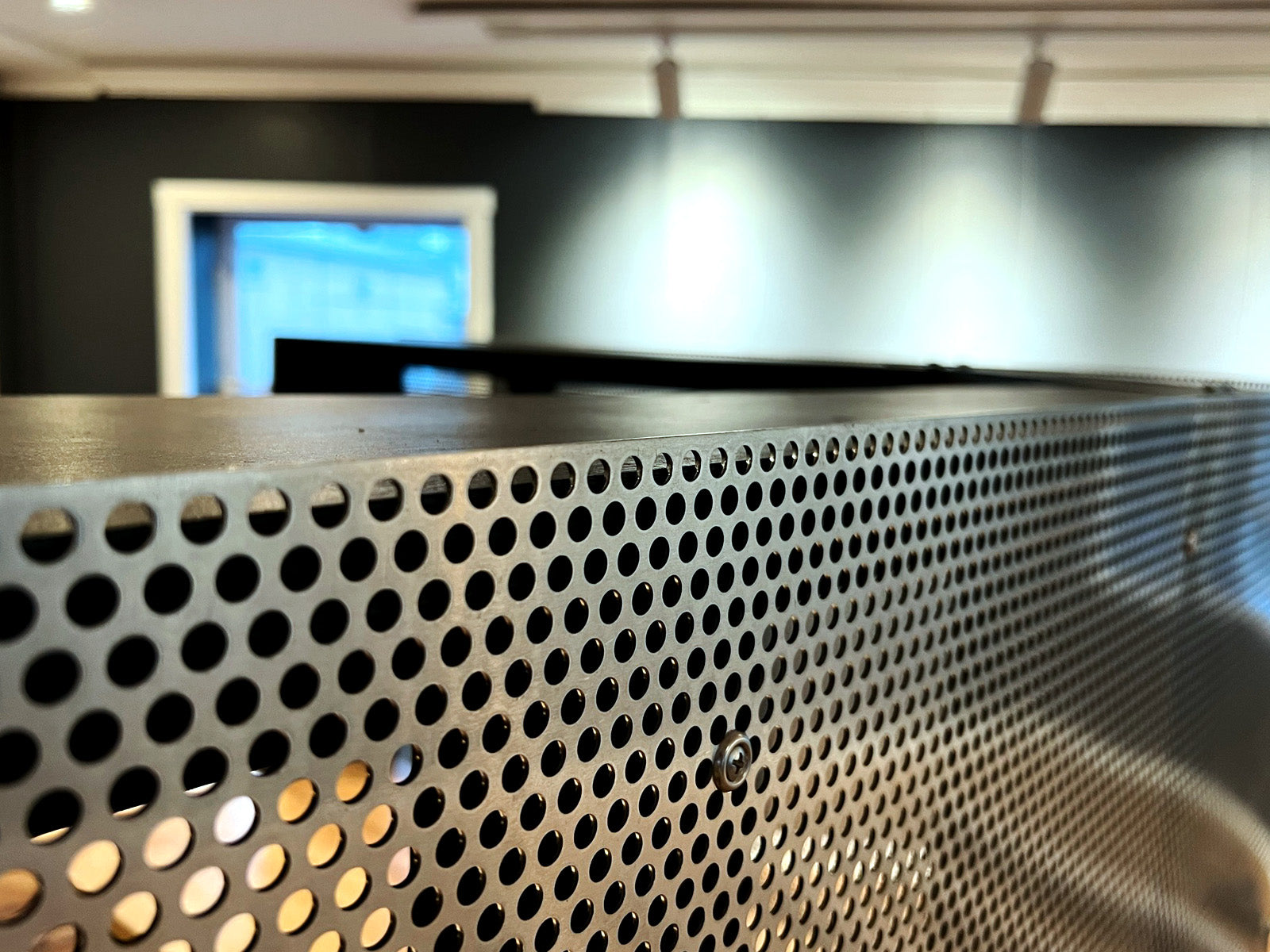 To separate my 'head-down' workspace from the gallery side of the studio, I integrated a large sheet of perforated metal. It provides a visual privacy without blocking light or airflow. It hides the clutter of the monitors from the client area while adding a distinct industrial texture to the room.