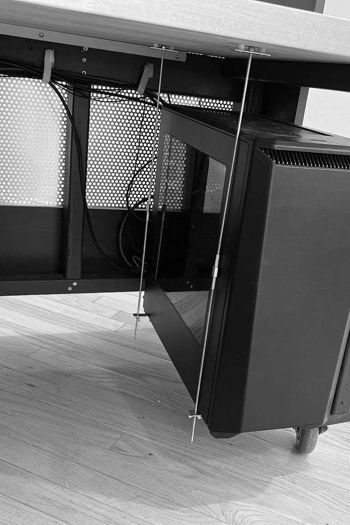 A messy desk kills creativity. I designed the structure with a 'one-plug' philosophy. The entire desk runs off a single heavy-duty outlet, feeding into an onboard cable management system tray hidden underneath. The tower PC rests on a custom floating trundle, keeping it off the floor for better airflow and dust reduction, while moving in sync with the rest of the unit.